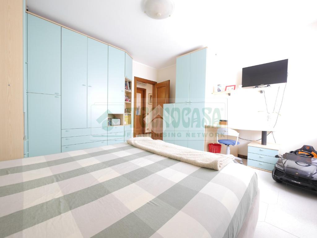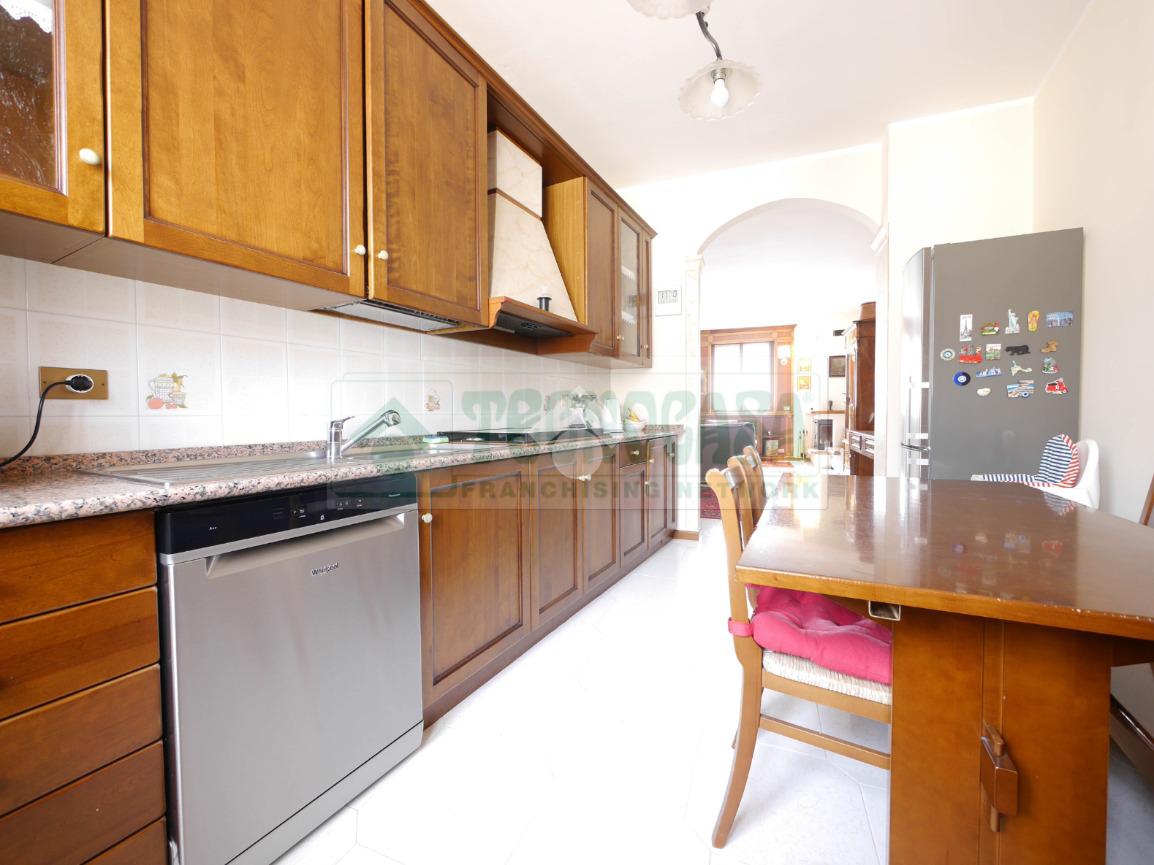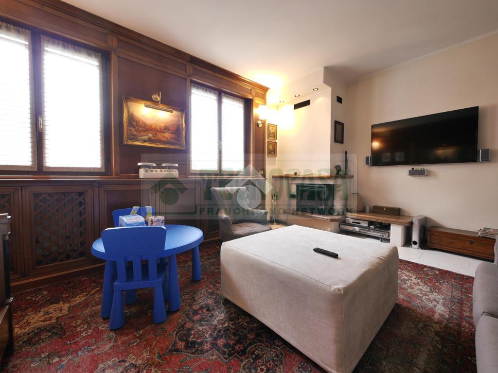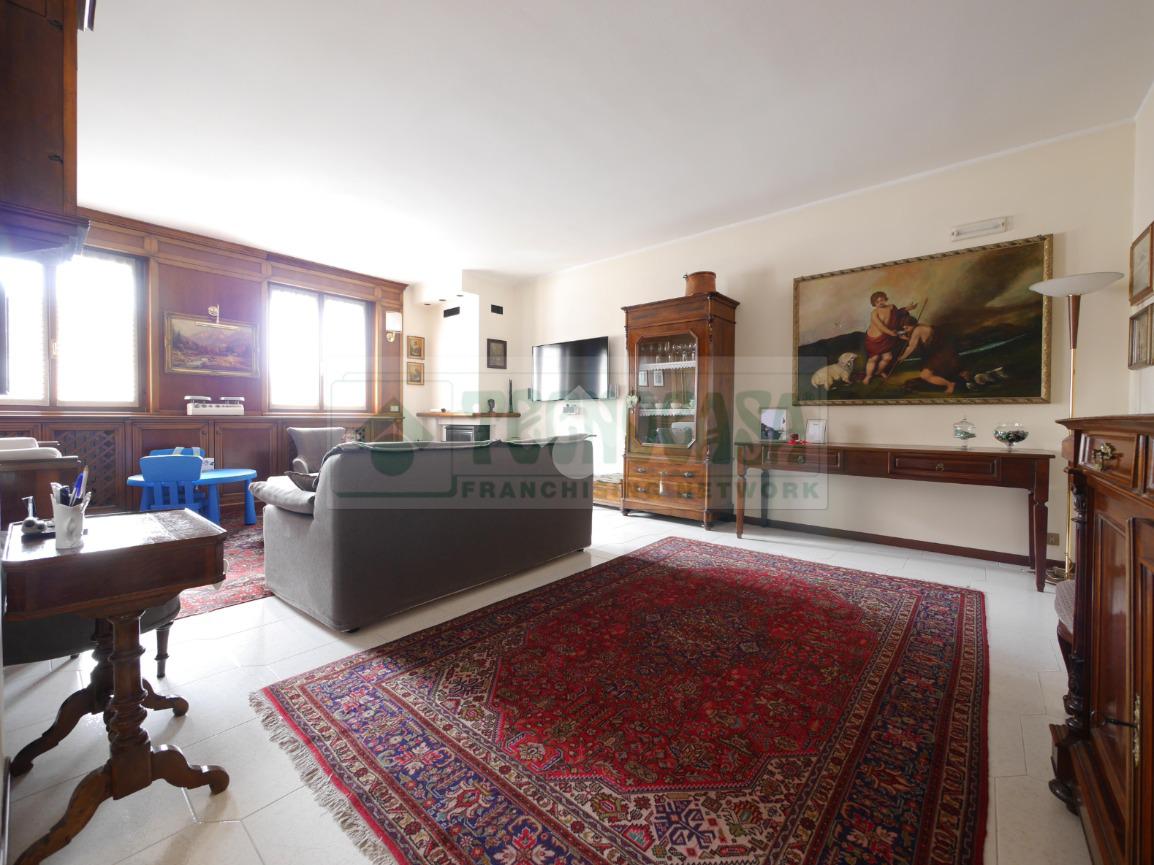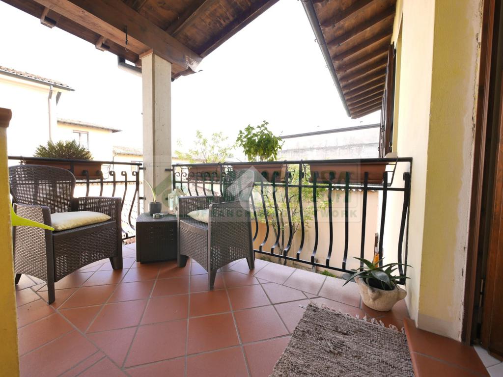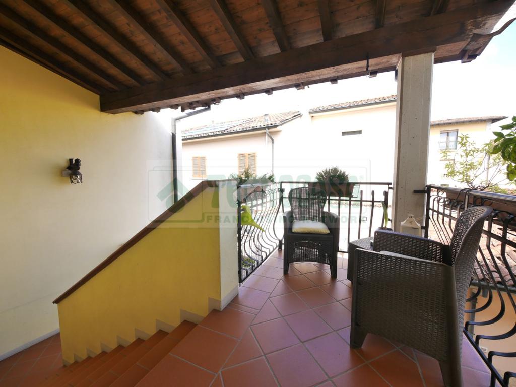 Roccafranca- Grande e ben tenuto appartamento, in contesto di 2 famiglie. Dal cortile in comune con un solo immobile, si sale la scala (riparata dalla tettoia) fino ad arrivare al balcone che dà l'accesso all'abitazione. Lo spazioso ingresso conduce al salone, impreziosito da una bellissima boiserie in legno su 2 pareti e riscaldato da un camino a legna ventilato. La cucina collegata è abitabile. Il disimpegno della zona notte, conduce alle altre stanze. La camera da letto dei bambini è di circa 18 mq; la camera matrimoniale è illuminata da graziosi faretti a soffitto e servita da una cabina armadio. Lo spazioso bagno, è dotato di doppio lavandino, vasca e doccia. La lavanderia ospita un lavabo, la lavatrice, l'asciugatrice e la caldaia. La proprietà si completa con un garage di circa 15 mq; la basculante è automatizzata. Immobile finito con: infissi in legno con doppio vetro, zanzariere, caldaia a condensazione di 4 anni, boiserie in legno, camino a legna ventilato. impianto di aria condizionata con n°2 split + motore, mobile con doppio lavandino, cabina armadio con arredo.